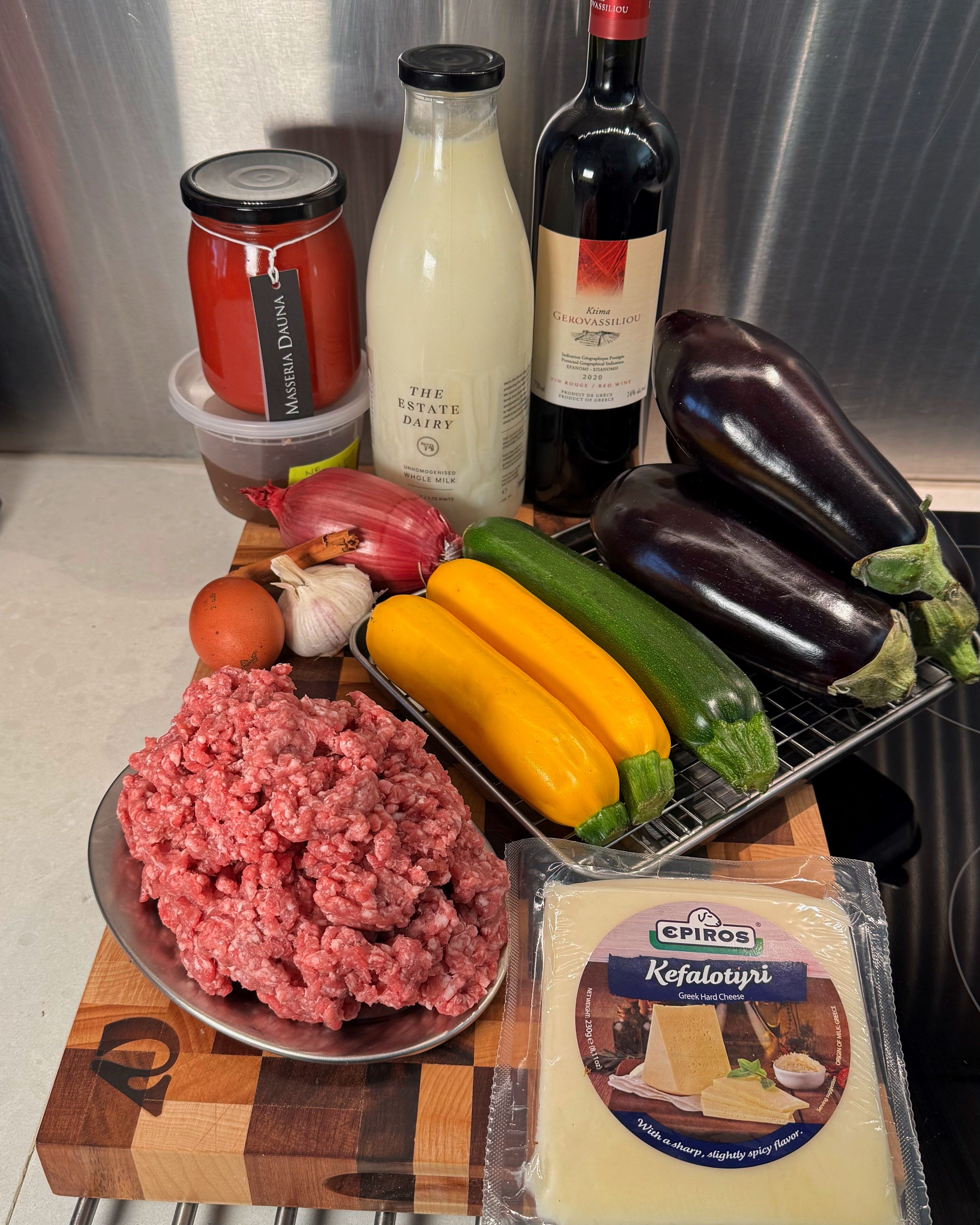 The moussaka is a rich, layered, and unapologetically indulgent dish. At its core, is a beautiful bake of spiced lamb ragu, golden pan-fried vegetables, and the silkiest bechamel. Instead of pasta however, we use golden brown, sautéed vegetables as our layers and rather than having the cheese and bechamel scattered throughout, this sits only at the very top. We also dial up the spice level of the ragu by introducing some cinnamon and dried herbs + a lovely glug of Greek red wine.